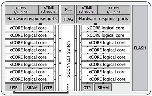 並列処理用として構築されているこのデバイスには、I/O、256KBのSRAM、8KBのワンタイムプログラマブル(OTP)メモリを備えた32ビットxCOREコアを8個搭載したxCOREタイルが2系統含まれています。xTIMEスケジューラはコアを管理し、I/Oピンからのハードウェアイベントによりコアを起動します。各コアは、xCORE VocalFusionキットでプリフラッシュされた2MBフラッシュメモリを利用し、キットに実装されている実行コードとデータを使用して、演算や信号処理、制御タスクを独立して実行することができます。