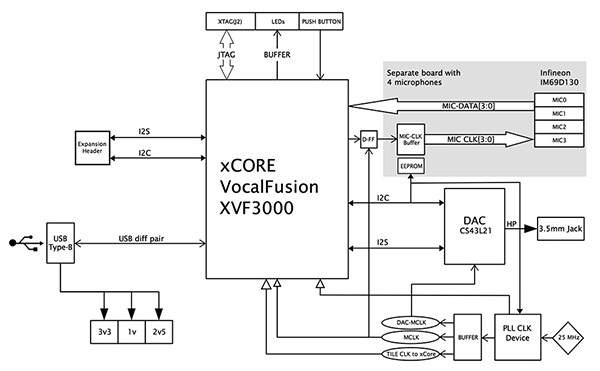 シンプルなセットアップ手順を選択すると、XMOSキットのハードウェアおよびソフトウェアコンポーネントを使用できます。このキットは、開発者にカスタムデザインの実装に関する包括的なリファレンスデザインを提供します。 XMOSキットの中心となるXMOS XVF3000-TQ128デバイスは、高い処理能力を有しています(図2)。