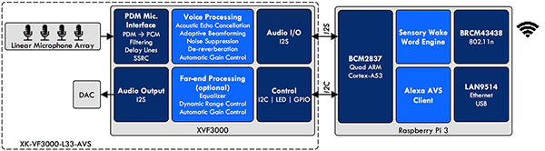 図4:XMOS VocalFusionキットは、Alexaの機能をベースボードとRaspberry Pi 3ボードに分離しています。前者は音声信号処理用、後者は音声認識用、上位レベルのAlexaサービス用である(画像ソース:XMOS)