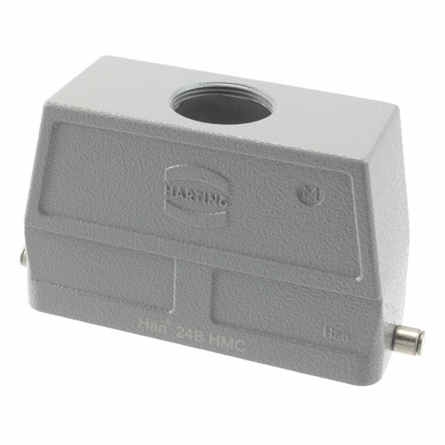 【仕様】・パッケージング:バルク・シリーズ:Han® B・コネクタタイプ:フード・スタイル:トップエントリ・サイズ:24B・ロック位置:ベースボトム上のロッキングクリップ(1)・ネジ番手:M32・サイズ/寸法:4.724インチ長さ x 1.693インチ幅 x 2.992インチ高さ(120.00mm x 43.00mm x 76.00mm)・ハウジング色:灰色・特長:-・防塵防水:IP65 - ほこり止め、防水型・ハウジング材料:アルミ、ダイキャスト・ハウジング仕上げ:パウダーコーティング・動作温度:-40°C~125°C