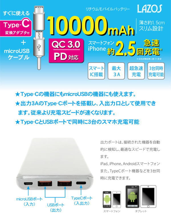 スマートホン/iPhoneを約2.5回分急速充電できます。Type-Cの機器にもmicroUSBの機器にも使えます。出力3AのType-Cポートを搭載し、入出力として使用できます。Type-CとUSBポートで、同時に3台のスマホを充電可能です。回路保護システムを採用。リチウムポリマーバッテリーを採用し、本体の厚さ1.5cmというスリムサイズを実現しました。