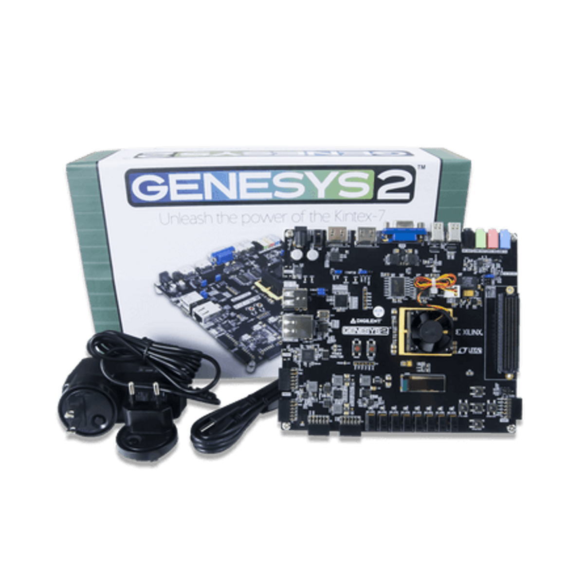 The Genesys 2 is a high-performance, ready-to-use FPGA development board built around the Xilinx Kintex-7 FPGA. The Genesys 2 is a powerhouse for data and video processing applications, but offers a variety of peripherals making it a great solution for a wide array of projects.Everything needed for robust multimedia applications is already available on the board: DisplayPort connectors, HDMI sink and source, 16-bit VGA, 128x32 pixel OLED screen, and an audio codec with four 3.5mm jacks. One can quickly get started with A/V, image processing, or other multimedia applications without needing additional hardware.Working on other applications, or looking for more customizability? The Genesys 2 also offers five Pmod ports and a fully populated FMC HPC connector, which provide limitless expansion options. Additionally, the 10/100/1000 Ethernet, USB 2.0, and a USB HID host for mice and keyboards make the Genesys 2 easily integrated with other systems.The powerful Kintex-7 XC7K325T-2FFG900C will have no trouble keeping up with your designs made in Vivado Design Suite or ISE. The free WebPACK version of the Vivado Design Suite does not support the Kintex-7 325T, but a voucher is provided for Vivado HL Design Edition at no extra cost.Guides and demos are available to help users get started quickly with the Genesys 2. These can be found through the Support Materials tab.