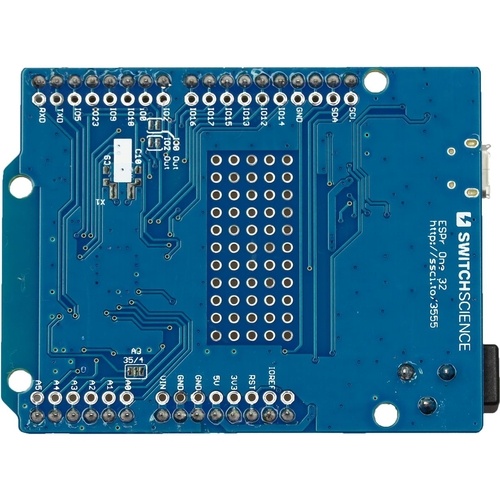ESP-WROOM-32をArduino UNOと同じ形状で利用可能な基板です。USB-シリアル変換や動作モード切替スイッチも搭載しています。ArduinoシールドをESP-WROOM-32と組み合わせて使いたい時などにどうぞ。小さいながらユニバーサルエリアも搭載しています。