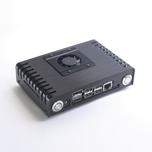 ナダ電子製のJetson Xavier NX 開発者キット用アルミケースです。写真のJetson Xavier NX 開発者キット本体、押しボタンスイッチや、外部アンテナは本製品には含まれておりません。熱伝導率の高いアルミ鋼材にヘアラインと黒アルマイトの表面処理をしたアルミケースです。Φ16押しボタンスイッチ、microSDカード、M.2 SSDヒートシンク、配線やカメラ用フレキシブルケーブルの取り出し等を考慮した設計です。