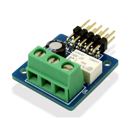 MESH GPIOブロックが出力する電源で動作するリレーボードです。MESH GPIOブロックの電源出力のON/OFFに応じてリレーがON/OFFします。これによりMESH の電源指令を利用して、外部装置のON/OFFコントロールが可能です。