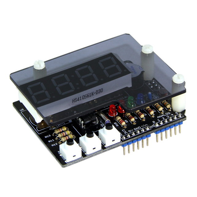 入門用のArduinoシールドキットです。完成時は時計として動作します。はんだ付けからArduinoのプログラムに至るまで電子工作の基礎を体験できます。