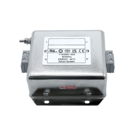 EMIフィルタ、電源ラインフィルタ、ノイズフィルタ、30A、115 / 250 V ac、1.相 シャーシーマウント【286-7269】