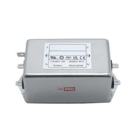 EMIフィルタ、電源ラインフィルタ、ノイズフィルタ、10A、115 / 250 V ac、1.相 シャーシーマウント【286-7288】