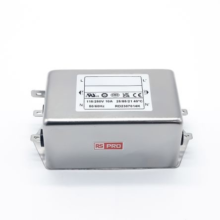 EMIフィルタ、電源ラインフィルタ、ノイズフィルタ、10A、115 / 250 V ac、1.相 シャーシーマウント【286-7297】