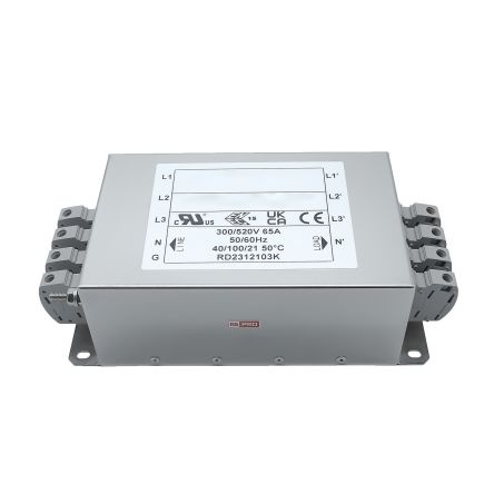 EMIフィルタ、電源ラインフィルタ、ノイズフィルタ、65A、300/520 V ac、3相 シャーシーマウント【286-7328】