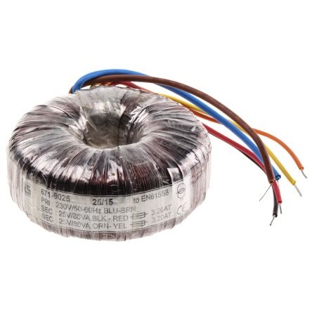 トロイダルトランス、1次:230V ac、2次:2 x 25V ac、電力:160VA