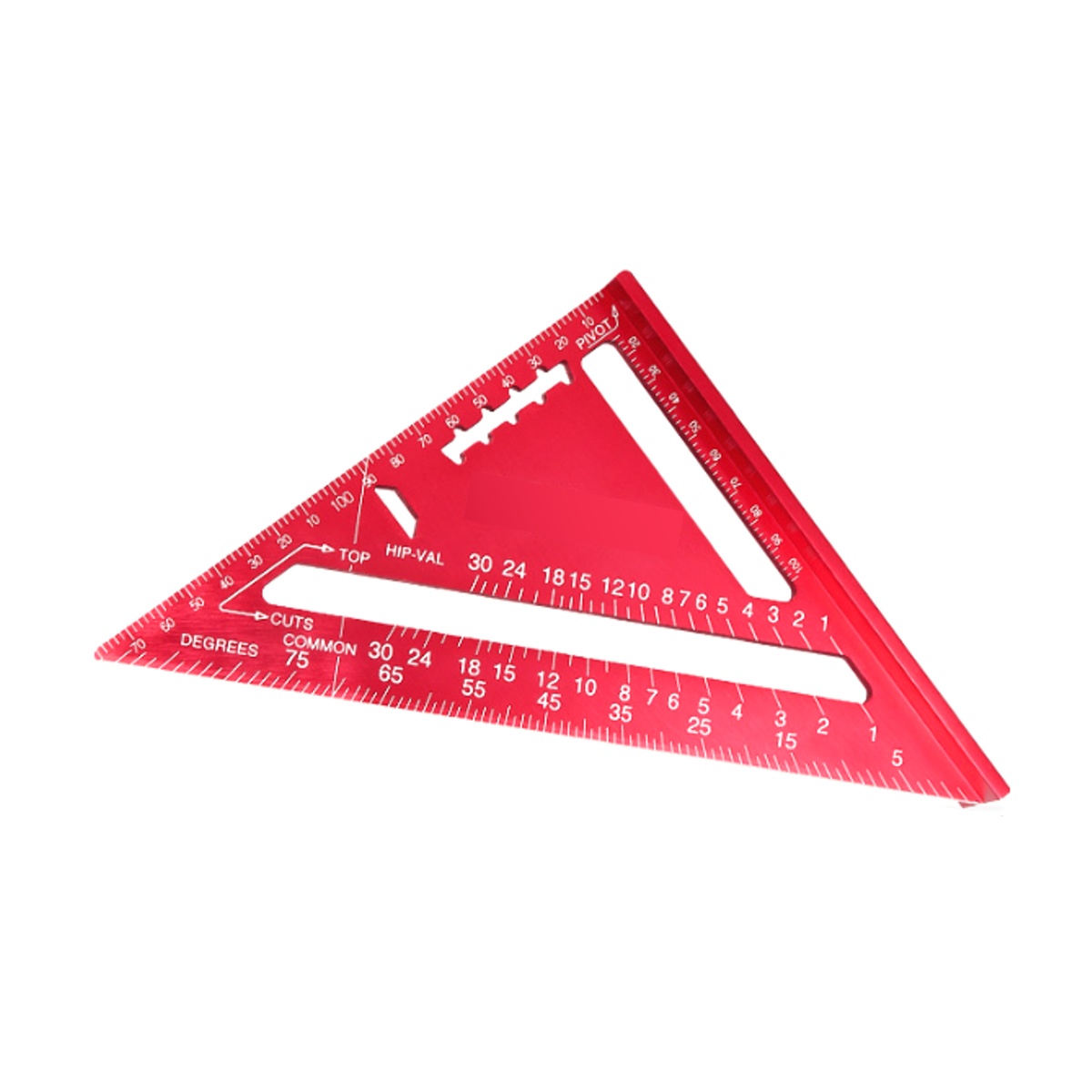 ・斜辺の角度目盛を活用することで、垂木用角度(common rafter)や隅木(hip rafter)、谷木(valley rafter)用角度を読み取ることができます。