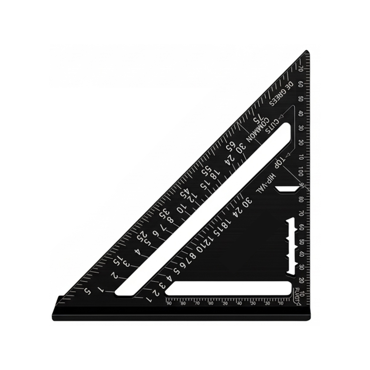 ・斜辺の角度目盛を活用することで、垂木用角度(common rafter)や隅木(hip rafter)、谷木(valley rafter)用角度を読み取ることができます。