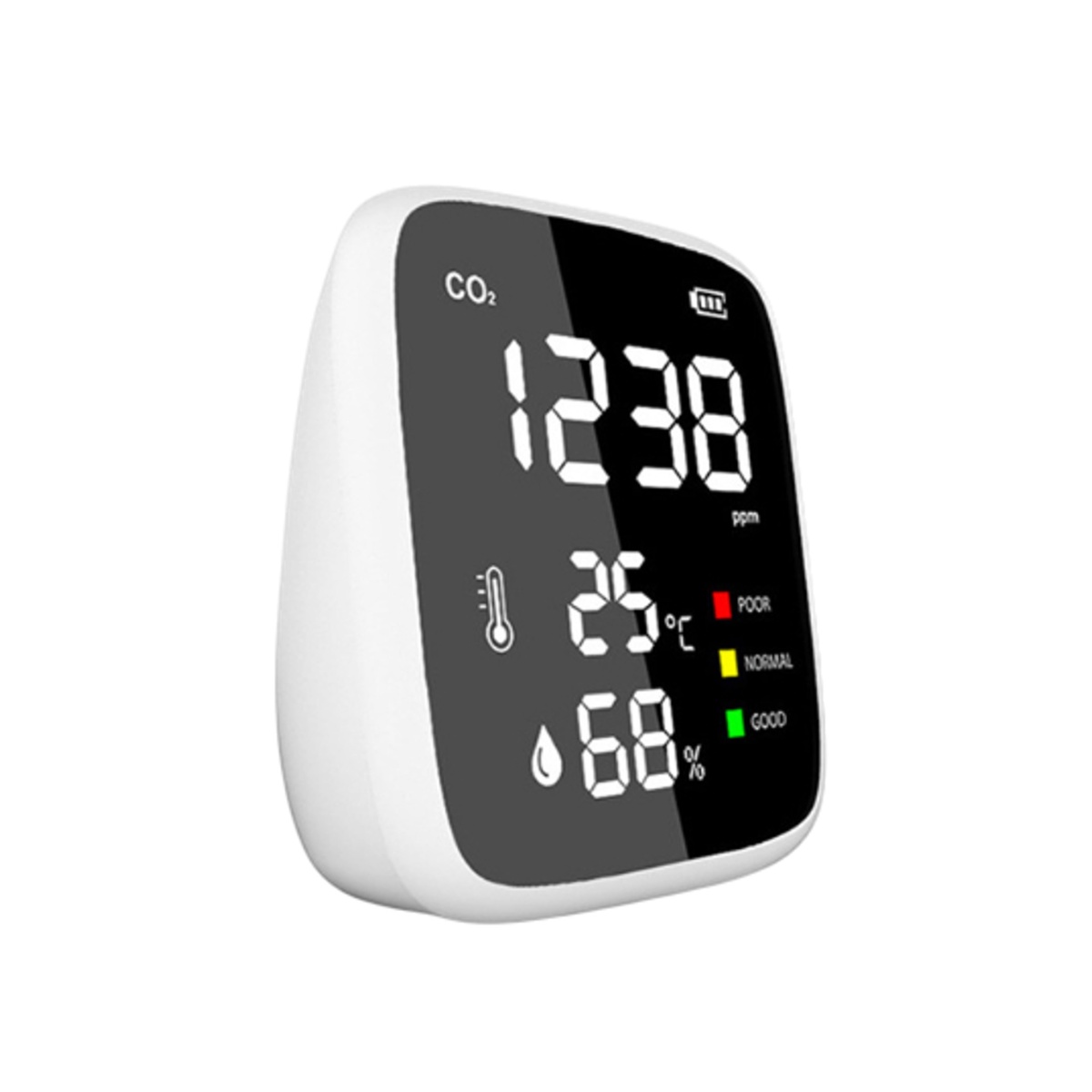 空間全体の空気環境を常時確認できる二酸化炭素モニターです。二酸化炭素濃度(ppm)、温度、湿度をリアルタイムで測定し表示します。室内環境管理の目安確認に適しています。CO2濃度レベルは、3色(緑/黄/赤色)の濃度インジケータで知らせます。