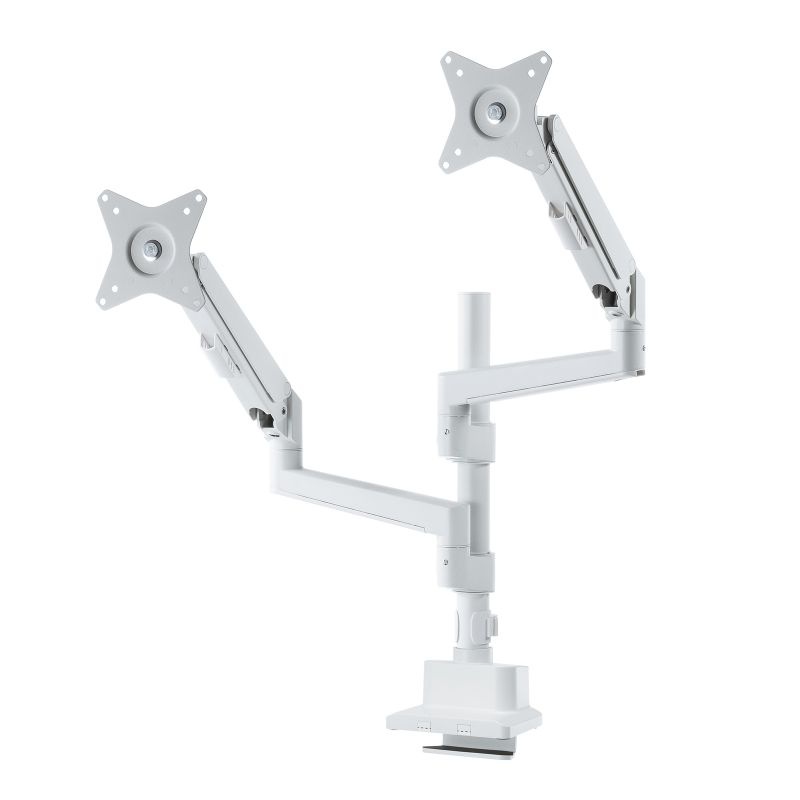 わずか奥行き38mmの薄型ショートクランプタイプのデュアルモニターアーム。支柱タイプで幅広い高さ調節が可能。ガススプリング式。ホワイト。