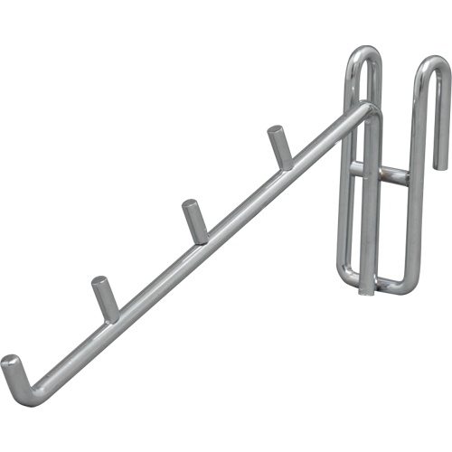メタルラックの別売4連フックです。棚板やメッシュパネルに取り付けられます。棚板に引っ掛けて、小物類を吊り下げて収納することが可能です。●本体サイズ(mm)200×80×35●適合ポール径(約)25mm●材質スチール+クロームメッキ仕上げ●耐荷重(約)3kg