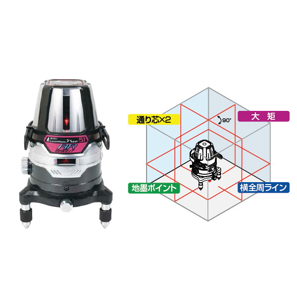 ●横全周+縦ライン4本のフルラインタイプ ●横4方向にレーザー光を射出することでラインが横全周に広がります。 ●明るい現場でもラインが良く見えます。 ●回しやすく三脚使用時の水平微調整が簡単に行えます。 ●三脚の足の調整をせずに水平出しができる画期的なシンワオリジナルのアダプターです。 ●ホコリの多い現場、急な雨でも安心です。