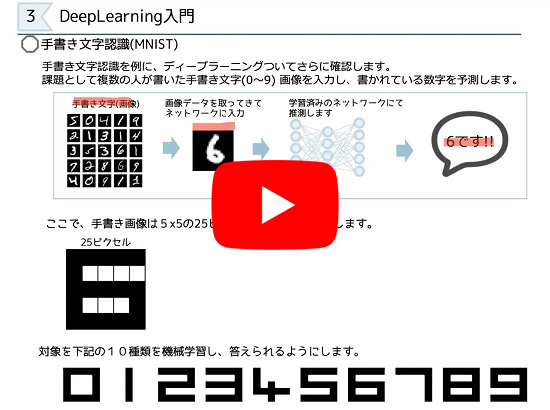 本セミナでは,まずディープラーニングの基本を学び,Python,Kerasを用いてラズベリー・パイでの手書き画像認識,カメラを接続しての画像認識,およびマイクからの音声入力によるAIスピーカをテーマとした演習を行います.