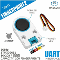 | ここでは、M5Stack社が開発した高性能な指紋認識センサ「M5Stack用Fingerprint2ユニット」をご紹介します。本製品は、STM32G031マイコンと指紋認証モジュールA-K323CPを組み合わせた、静電容量式の指紋認証ユニットです。 A-K323CPは、指紋の取得から特徴抽出、照合、保存、検索までをすべて内部で処理できるオールインワンの指紋認証モジュールで、解像度は508dpi、画像サイズは80×208ピクセル(8230バイト)です。小規模なアクセス制御や個人認証用途に十分な100件の指紋を登録でき、通信にはUART(115200bps、8N1)を使用します。 本ユニットは、乾燥した指だけでなく湿った指にも対応できる指紋認識アルゴリズムを内蔵しています。さらに、柔軟な指紋データ管理、高いデータセキュリティ、高速検索、ポジショニングなどの機能も備えています。また、指紋認証の待機・成功・失敗といった状態を表示するために、7色のRGB LEDリングと電源インジケータを搭載しています。LEDの色はUART経由でコマンドを送信することで変更できます。 ▽M5Stack用Fingerprint2 ユニット(A-K323CP)【M5STACK-U203】