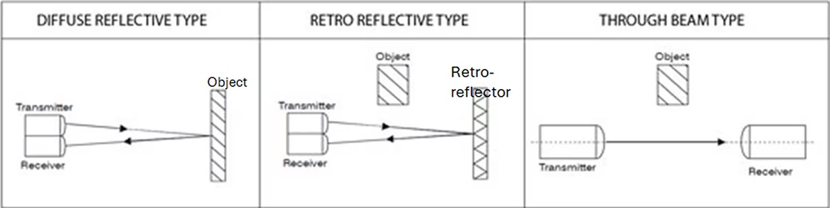 図1:PE近接センシングは、3つの物理的配置で透過光ビームと対応するレシーバを使用することができます。(画像提供:Proximity Switch)