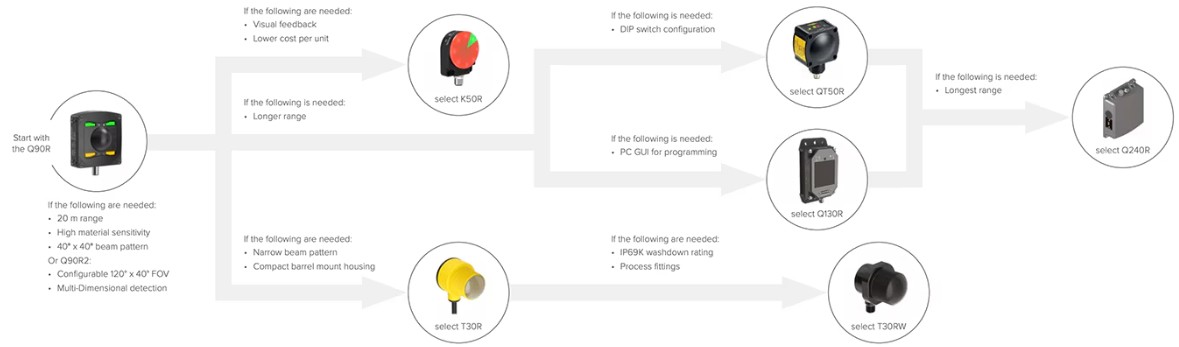 レーダセンサを選ぶ際に考慮すべき要素は数多くあります。基本的な動作パラメータに加えて、レーダセンサには、コスト、耐久性、使いやすさに影響するさまざまな特長があります。図1は、Banner Engineeringのレーダセンサを例に、これらの判断ポイントのいくつかを示すフローチャートです。