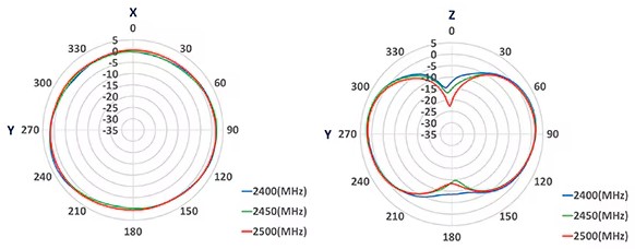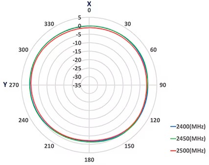 たとえば、AmphenolのST0147-00-011-Aは、2.4GHzの面実装チップアンテナです。このアンテナは、2.4~2.5GHz周波数帯で全方向性の放射パターンを提供します(図6)。サイズは3.05×1.6×0.55mmで、インピーダンスは50Ωです。RLは-7dB未満、ピークゲインは3.7dBiで、平均効率は80%です。