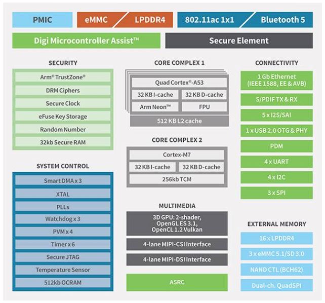 図2:NXPのi.MX 8M Nanoマルチコアプロセッサに基づくDigiのSoMは、一般的な組み込みシステム設計に必要なメモリ、コネクティビティオプション、セキュリティ、電源管理機能を内蔵しています。(画像提供:Digi)