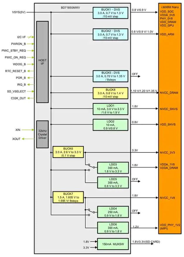 NXPのi.MX 8M Nanoプロセッサをサポートするために特別に設計されたROHM BD71850MWVは、プライマリVSYS 5V電源から電源レールの完全なセットを提供する複数の降圧レギュレータと低ドロップアウト(LDO)レギュレータを内蔵しています(図4)。