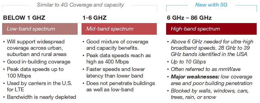 図2:3つの主な周波数帯域内の5Gスペクトラム(画像提供:Voler Systems)