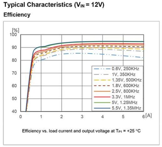 図3:PoLを選択する際には、この効率曲線についても検討が必要。このグラフに示されているのはPMU8318製品の標準効率についての特性(12VIN、複数VOUT、表示されているスイッチング周波数レベル、最大6A)(画像提供:Flex Power Modules)