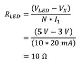 並列構成(A)の場合、RLEDの値は、予め決められた供給電圧(VLED)、LEDの公称順方向電圧、並列LEDの数に依存し、各LEDが約20mAを消費します。たとえば、10個の並列白色LED(20mA時の順方向電圧が約3.0V)があり、VLEDが5Vの場合、RLEDは10Ωです。RLEDの10Ωという値は、式1で求められます。