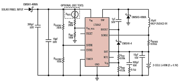 LT3652の入力安定化ループには、ソーラーパネルの最大電力動作点を判定する機能もあります。これにより、太陽エネルギーからの変換効率を最適化し、バッテリに最大の出力電力を供給できます。