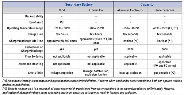 表1:充電式電池とコンデンサには多岐にわたる重要な性質があります。(画像提供:KEMET Corp.)