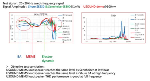 USoundのシングルドライバMEMSスピーカは大きな帯域幅を有しています。図4は、中国の大手オーディオ企業がUSoundのMEMS使用イヤホンを2つの一流ブランドと比較したテストレポートです。この結果から、シングルMEMSドライバがダイナミック型構成およびマルチドライババランスドアーマチュア型構成と容易に渡り合えるものであることがはっきりと分かります。