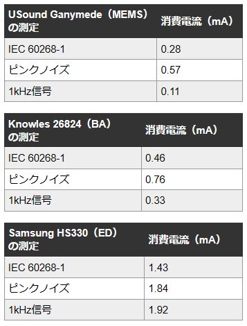 表1:3種類の方法により94dB SPL時に測定したUSound製MEMSスピーカの駆動電流と、参照用のバランスドアーマチュア型スピーカ(Knowles 26824)およびダイナミック型スピーカ(Samsung HS330)の比較。
