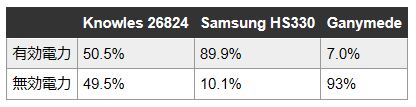 表2:Knowlesのスピーカ、Samsungのヘッドセット、USoundのMEMSスピーカの有効電力および実電力の比率の比較。