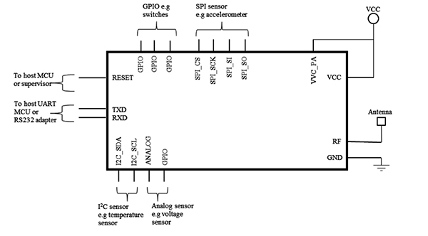 これらのモジュールは、センサインターフェースと制御論理を内蔵しているため、速度設計にも役立ちます。たとえば、RadiocraftsのRC1880CEF-SPRは、ADCへのアナログ入力、スイッチ用GPIO、適合センサ用のI2CおよびSPI、ホストプロセッサへの接続用UARTインターフェースを備えています(図4)。