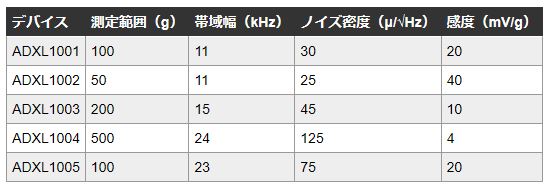 表1:Analog Devices ADXL100x振動センサの性能仕様(表提供:Analog Devices)
