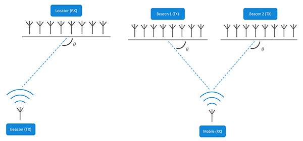 AoAでは、受信デバイスは個別オブジェクトの到来角をトラッキングします。AoDでは、受信デバイスは複数のビーコンからの角度とその位置を使用して、空間内の自身の位置を計算します(図1)。