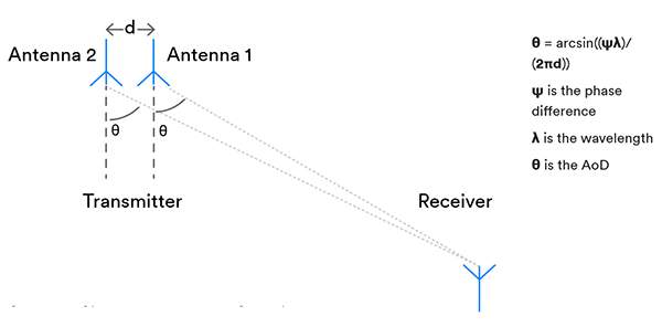 AoDによる方法では、状況は正反対です。このシナリオでは、アンテナアレイを備えたデバイスが各アンテナを介して信号を送信します。アレイ内のアンテナの各信号パケットがレシーバの単一アンテナに到達すると、トランスミッタからの移動距離の差により、以前の信号から位相シフトされます(図4)。