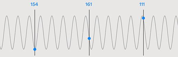さまざまなIQサンプリングのタイミング設定を採用できますが、一般的に1つのIQサンプルは各アンテナのリファレンス期間内で1µsまたは2µsごとに記録され、その結果はBLE SoCのRAMに記録されます。アレイ内の異なるアンテナによってサンプリングされる際に、受信信号の位相がどのように変化するかがわかります[1](図5)。