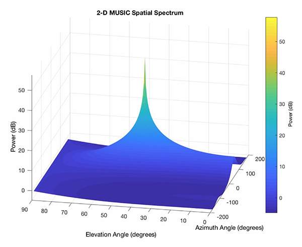 図7:MUSICアルゴリズムは、IQサンプルを使用してパワー疑似スペクトルを生成します。そのピークにより送信デバイスの位置を特定できます。この例は、送信デバイスが50度のアジマス角と45度の仰角で配置された2次元の疑似スペクトルを示しています。(画像提供:Silicon Labs)