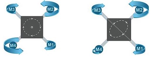 クワッドコプターでは、機体の対角線上に配置されたモータのペアが同じ方向に回転します。ただし、他の2つのモータとは反対方向に回転します。4つのモータがすべて同じ速度で回転する場合、ドローンは上昇、下降、またはホバリングできます。対角線上のペアが他のペアよりも高速で回転する場合、ドローンはヨーイングし、同じ水平プレーン上にとどまりつつその重心の周辺を回転します(図1の左)。