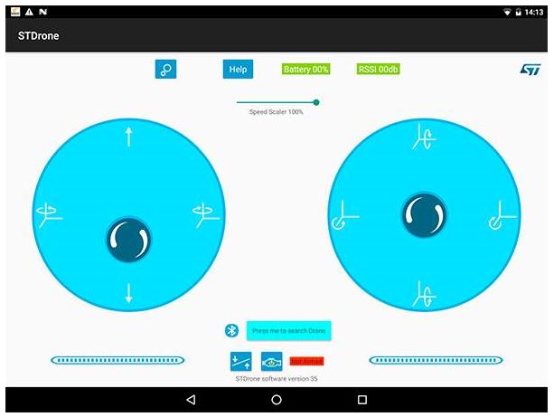 飛行の準備と制御を簡素化するため、キットはSTMicroelectronicsのST Drone AndroidモバイルアプリでBluetooth接続オプションを使用するように事前設定されています。このアプリは仮想リモコンコンソールとして設計され、ユーザーに制御アイコンや2個の仮想ジョイスティックを備えたシンプルな飛行制御インターフェースを提供します(図4)。