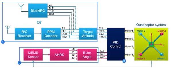 図5:STMicroelectronicsの小型ドローン飛行制御ソフトウェアは、リモート制御入力(青色のボックス、(1))、位置測定(赤色のボックス、(2))、およびPID制御(濃い青色のボックス、(3))に対応できるように個別モジュールを中心にその機能を構築しています。PID制御は、次にクワッドコプターの4つのモータを駆動します。(画像提供:STMicroelectronics)