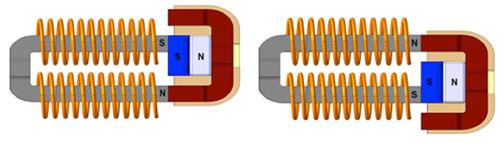 図3、右)。この動作によりワイヤコイルの磁界の極性が逆転し、磁気誘導の原理に従って電気エネルギーのパルスが生成されます。アクチュエータを放すことによって磁気ブロックが元の位置に戻り、その結果として逆の極性のエネルギーパルスが生成されます。