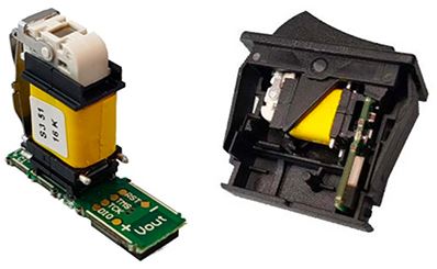 AFIG-0007環境発電機に内蔵されているアクチュエータを押すと、磁気ブロックは静止位置(左)から伸長位置(右)へ移動します。これにより、最初にアクチュエータを押した時点と次にアクチュエータを放した時点で、それぞれエネルギーパルスが生成されます。(画像提供: ZF Electronics)