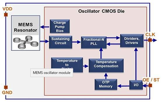 図4:MEMS発振器モジュールでは、単一パッケージにMEMS機械構造と発振器/コントローラICが結合されています。(画像提供:SiTime)