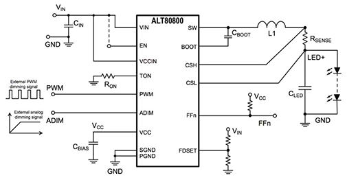 図6:Allegro MicroSystemsのALT80800などの高度なLEDドライバは、PWMやアナログ入力で制御する調光により、数点の増設コンポーネントだけでLEDストリングを駆動させることができます。(画像提供:Allegro MicroSystems)