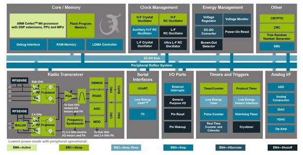 BMD-330と同様に、EFR32FG14はARM® Cortex®-M4コアも使用しますが、このチップは低電力のIoTアプリケーションに対象を絞っているため、64MHzではなく最大40MHzで動作します。256KBのフラッシュと32KBのRAMが搭載されています。このチップは2.4GHzとGHz未満(915MHz)両方の動作をサポートし、アンテナネットワークマッチングに対するガイドが提供されます。また、このチップはアンテナダイバーシティもサポートし、周波数選択性フェージングの影響を抑えます。
